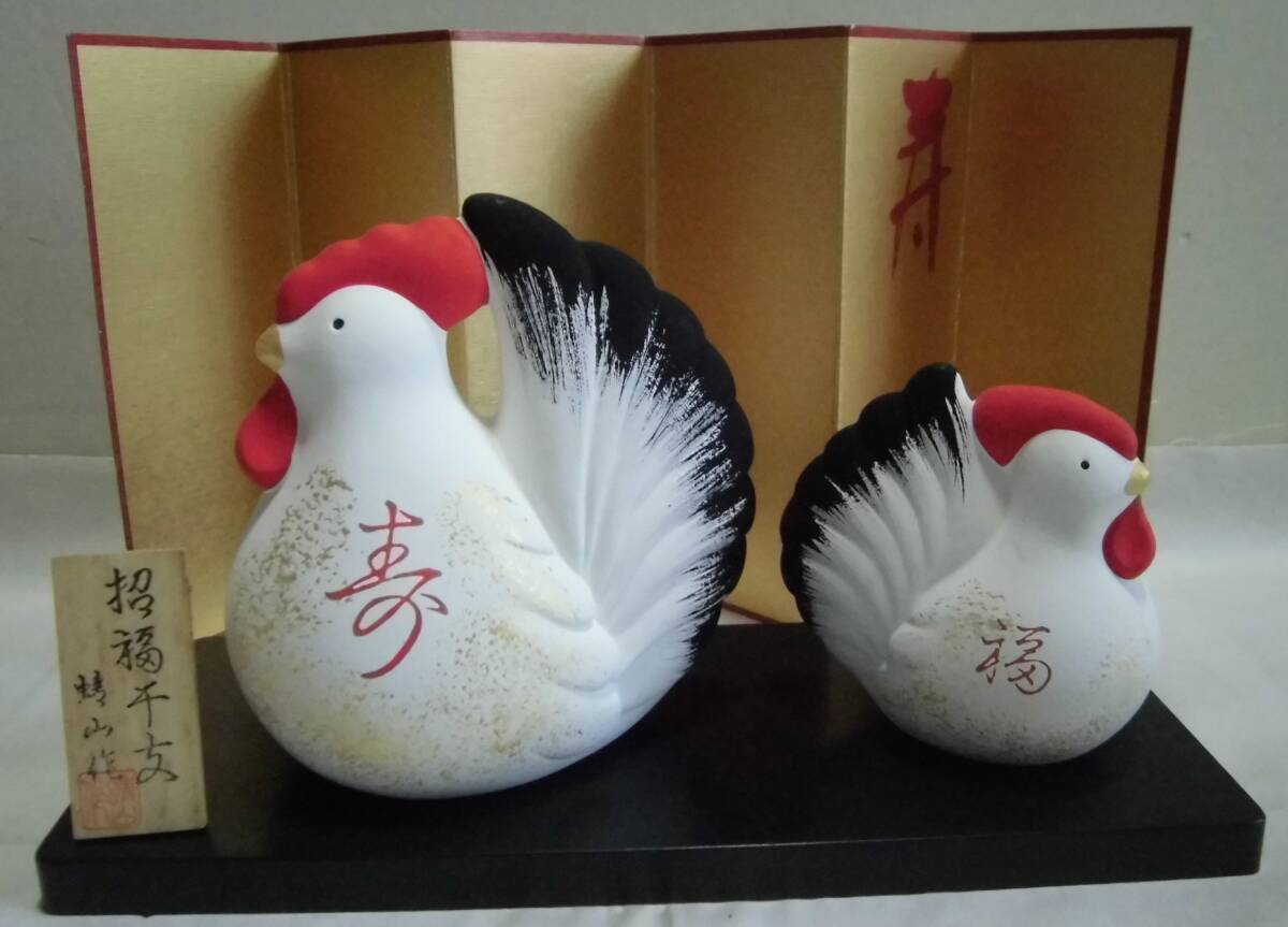 - 干支置物 尾長酉 親子 計2体 飾り台 風付 蜻山作 箱入り 色絵 金彩 鶏 にわとり 陶人形 土人形 招福 開運 縁起物 飾り物 オブジェ 工芸品