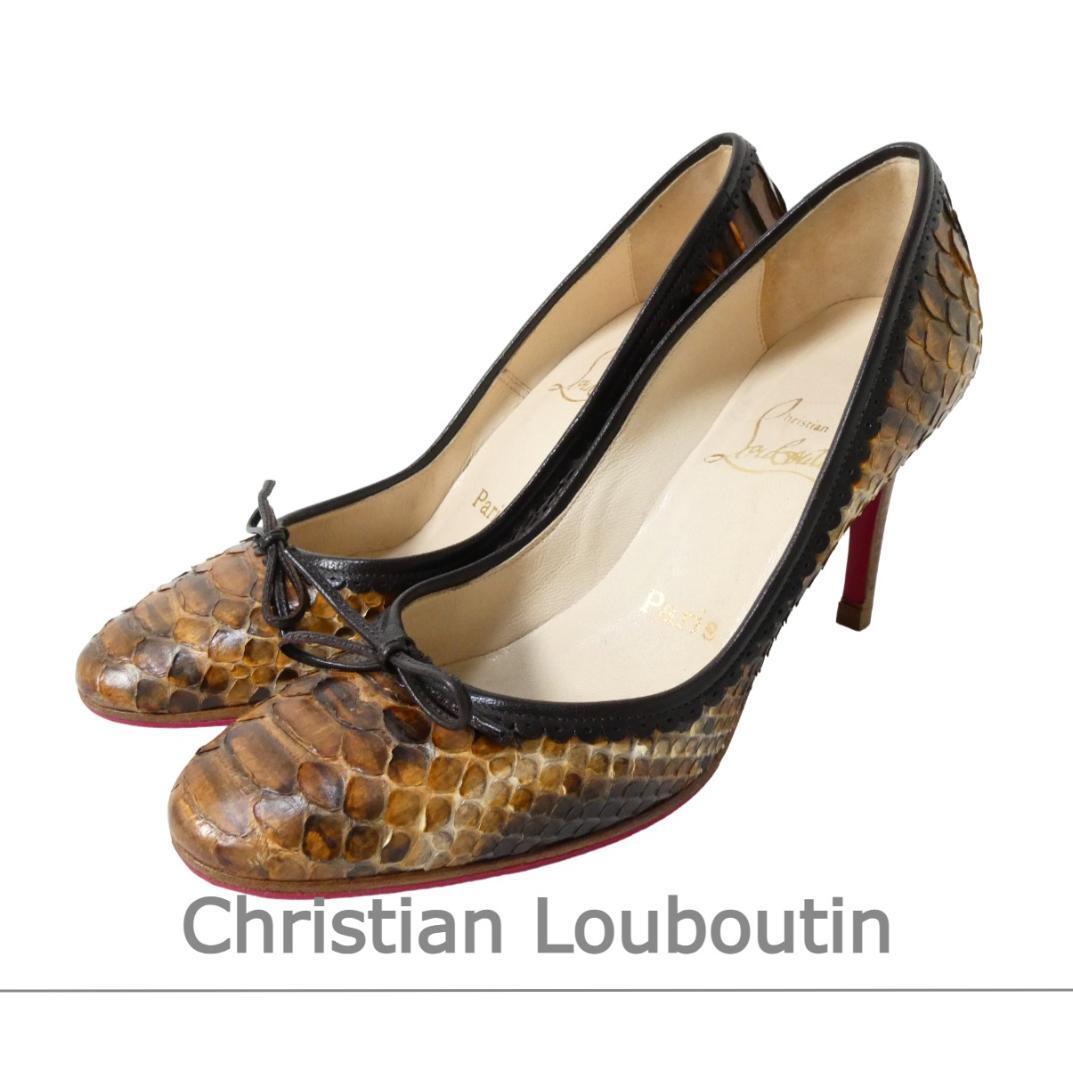 - Christian Louboutin クリスチャンルブタン サイズ35 約22㎝ パイソン レザー リボン ラウンドトゥ ピンヒール パンプス 茶 ブラウン