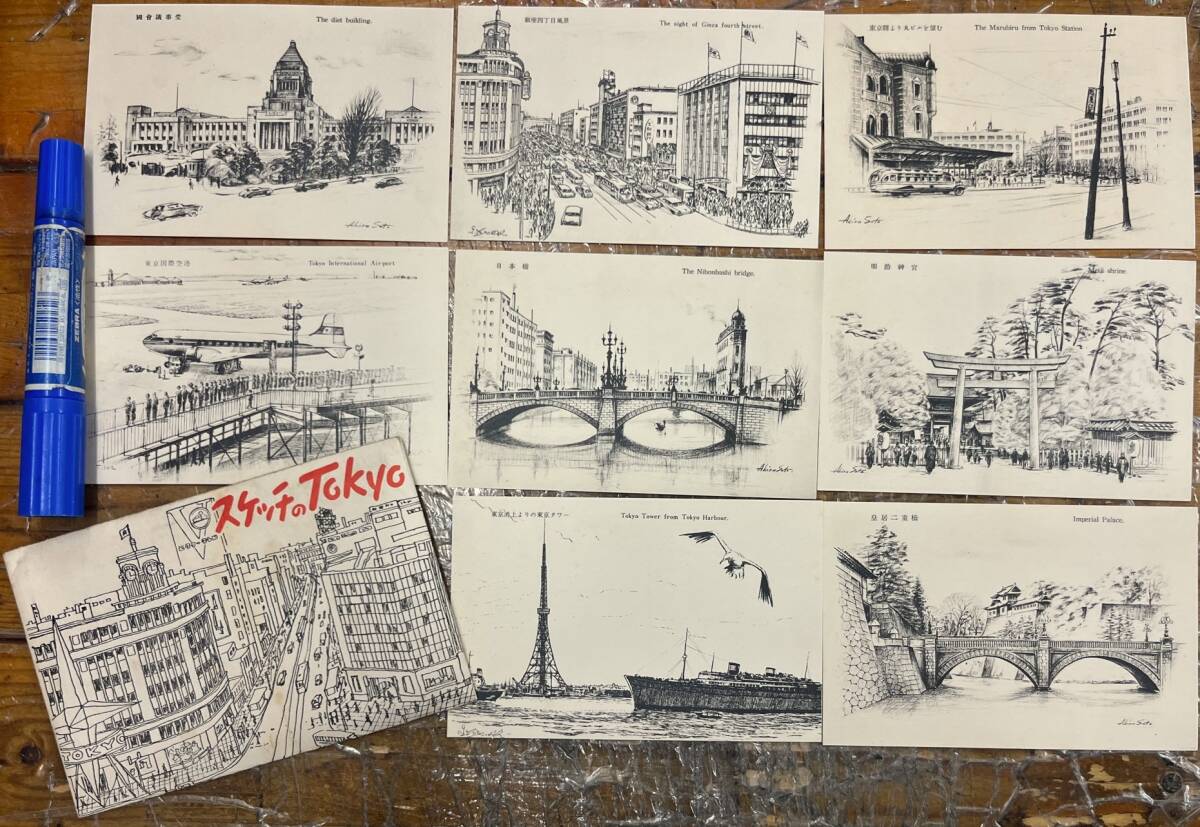 > 昔の東京 戦後絵葉書 スケッチ★袋付/8枚★銀座四丁目 東京駅より丸ビル 東京タワー 日本橋 東京国際空港 明治神宮 他★昭和33年-40年代