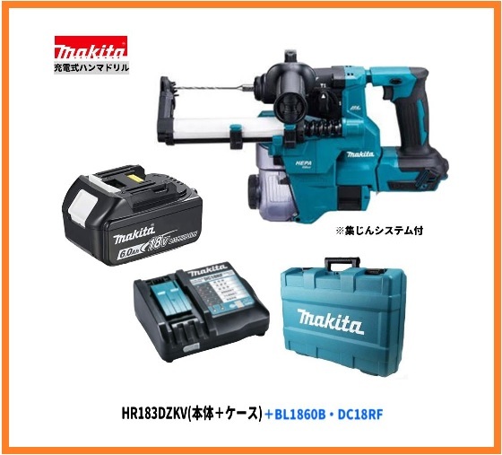 > マキタ 18mm 18V 充電式ハンマドリル HR183DZKV (本体+ケース) [集塵システム付]+充電器(DC18RF)[USB端子付]+バッテリ(BL1860B)[6.0Ah]