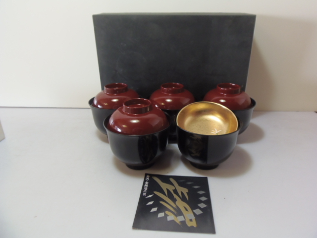 ●sk180 【箔一】 小吸物椀 手書き 日の出 絵違い 5客セット ※難有(白い曇りシミ多々有)