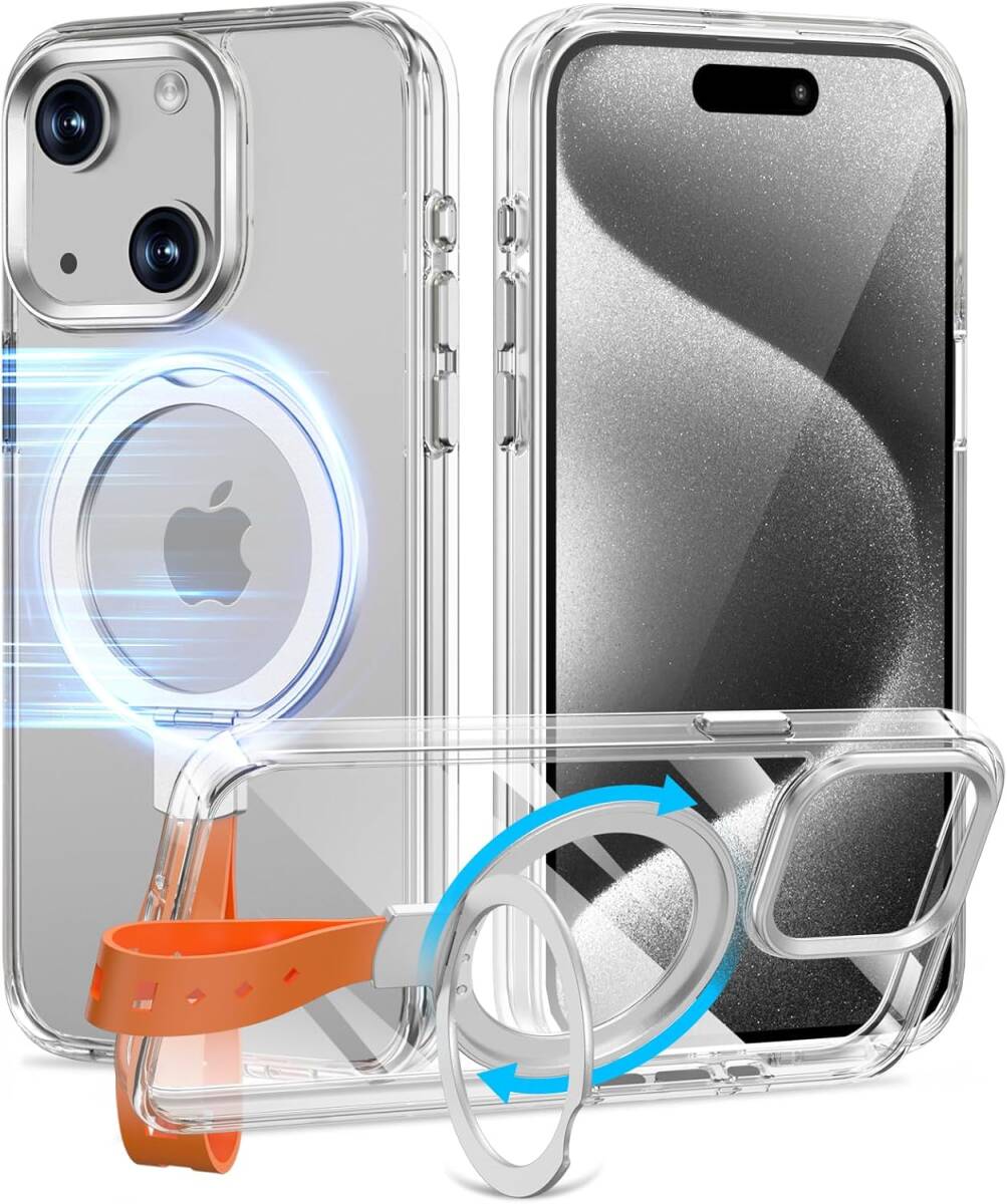 - 送料無料★iphone16 plus 用 ケース「magsafe ケース+360°回転スタンド 縦横両対応」 スマホケース 透明薄型、軽量、higher クリアケース