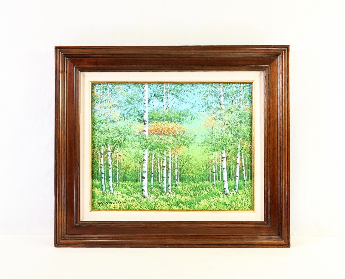 > 真作 吉田敏之 油彩「白樺」画寸 41cm×32cm F6 岐阜県出身 應美会会員 新緑に包まれた白樺森林 静寂感、爽やかな空気感まで伝わる 9838