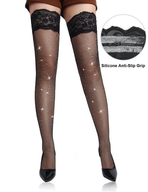 - 2146 大きいサイズ体重45-80kg 太腿周り51-61cm ガーターストッキング ニーハイ 網タイツ 黒 コスプレ ラインストーン