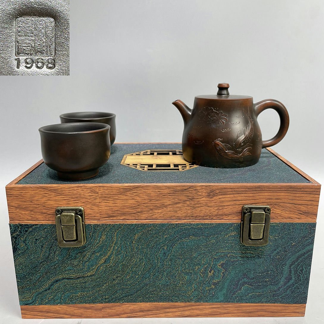 > ▼渡鶴羽▼P876時代朱泥 顧景舟 彫刻年年有魚 紫砂壺 在銘 /紫砂 煎茶道具 朱泥 茶壺
