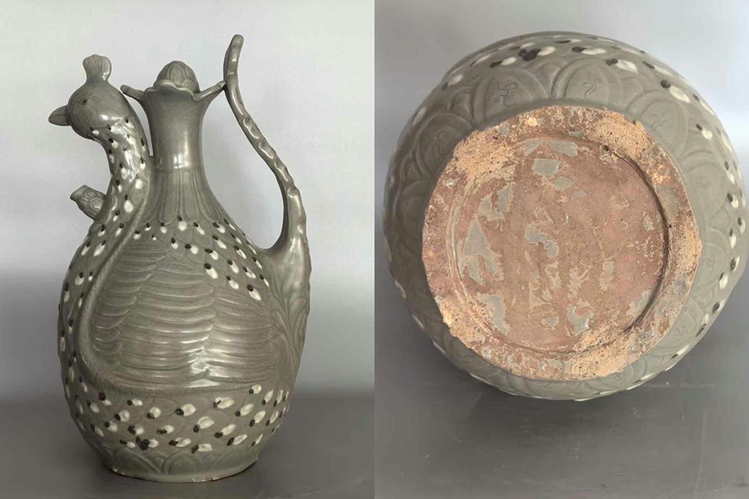 - ▼渡鶴羽▼P748朝鮮珍品旧蔵 朝鮮美術 高麗磁 朝鮮古陶磁器 古高麗 李朝 高麗青磁黒白象嵌水壺