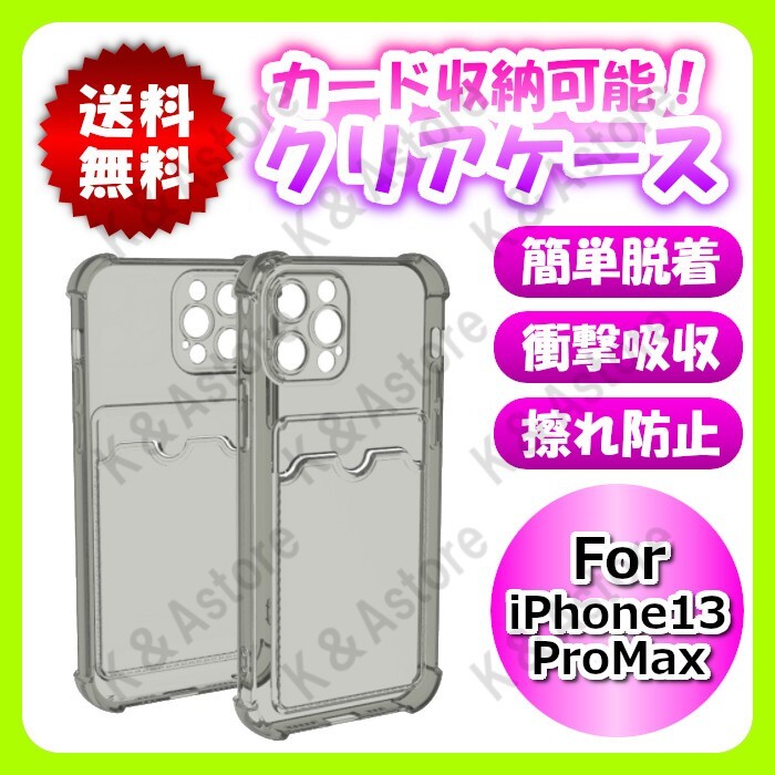 > iPhone13promax スマホ ソフトケース カバー ブラッククリア 透明 カード収納 カード入れ ポケット付き