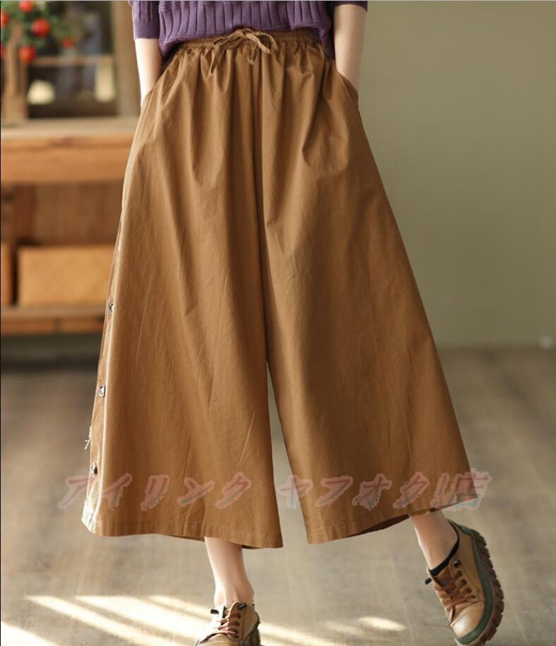 - ☆新品カジュアル ゆったり ワイドパンツ レディース コットン ガウチョパンツ 上質 体型カバー 無地 通勤 ブラウン