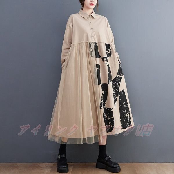 - ☆新品Fサイズ ワンピース 長袖 ロング丈 きれいめ プリント 切り替え シャツワンピース ロングワンピ 着痩せ カーキ