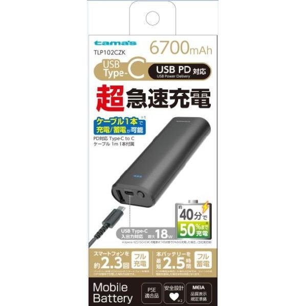 > 多摩電子工業 超急速充電 PD対応 TLP102CZK モバイルバッテリー 6700mAh ブラック タイプC 新品
