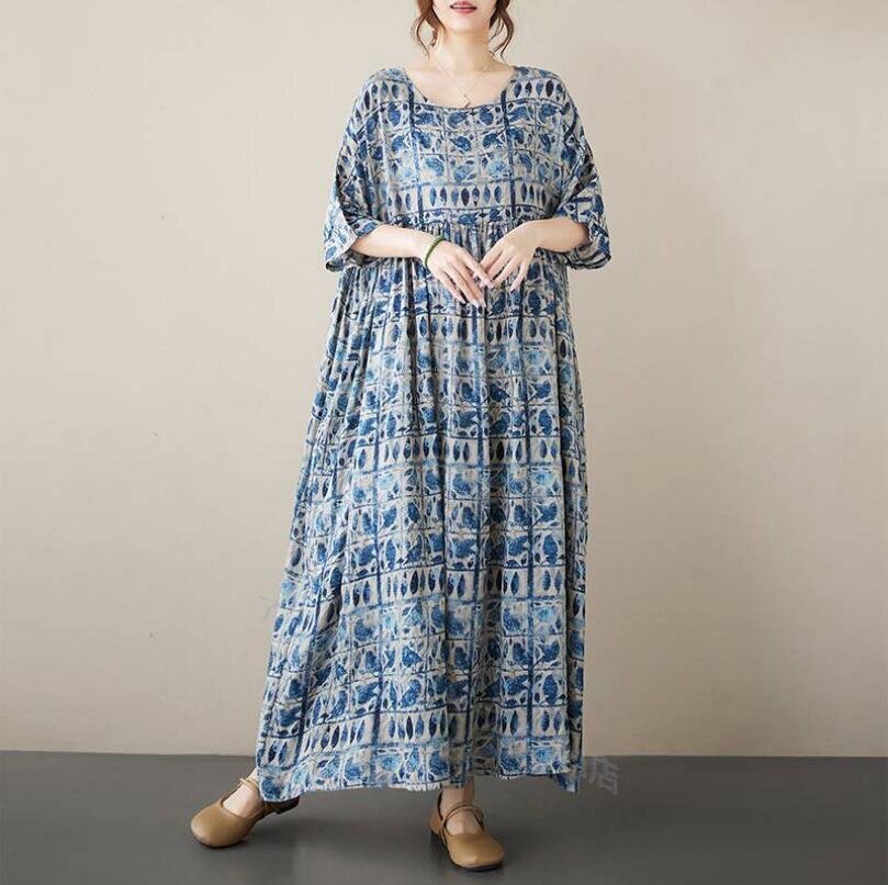 - 新品☆カジュアルロングワンピース 花柄 綿麻 半袖 ポケット付き ワンピース プリント 総柄 ゆったり 体型カバー フレアワンピースF