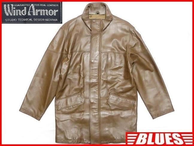 > 即決★Wind Armor★メンズL レザーステンカラーコート ウィンドアーマー 茶 ブラウン 本革 ジャケット 本皮 ビジネス 革ジャン ロング