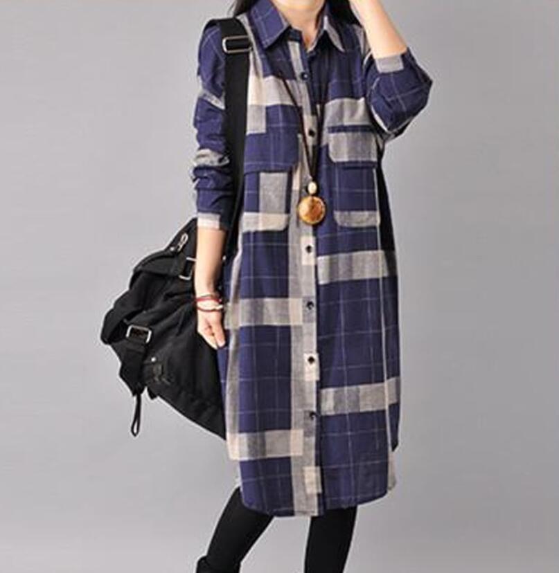 - 秋新作/シャツワンピース チュニック ワンピース 長袖 チェック柄 ロングシャツ 膝丈 綿麻 ゆったり 大きいサイズ お出かけ 通勤 上品/ 紺