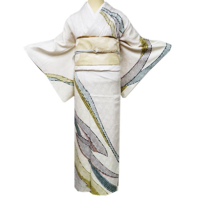 > 訪問着 着物 中古 正絹 袷 フォーマル 絞り 蔓帯文 地模様 オフホワイト 多色 身丈156cm 裄65cm M きもの北條 A1107-5