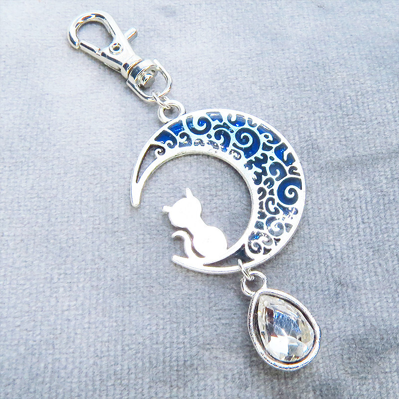 - アンティークシルバー ブルーレジンで彩色した猫が座る三日月モチーフのキーホルダー 金具変更可