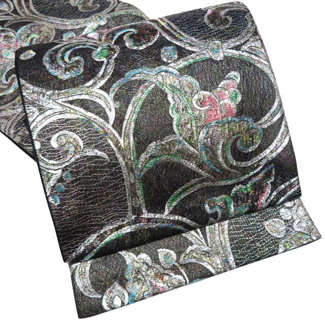 - 袋帯 中古 リサイクル 正絹 フォーマル 仕立て上がり 六通 花唐草模様 花紋 華文 箔糸 黒色 多色 銀 きもの北條 A1108-9