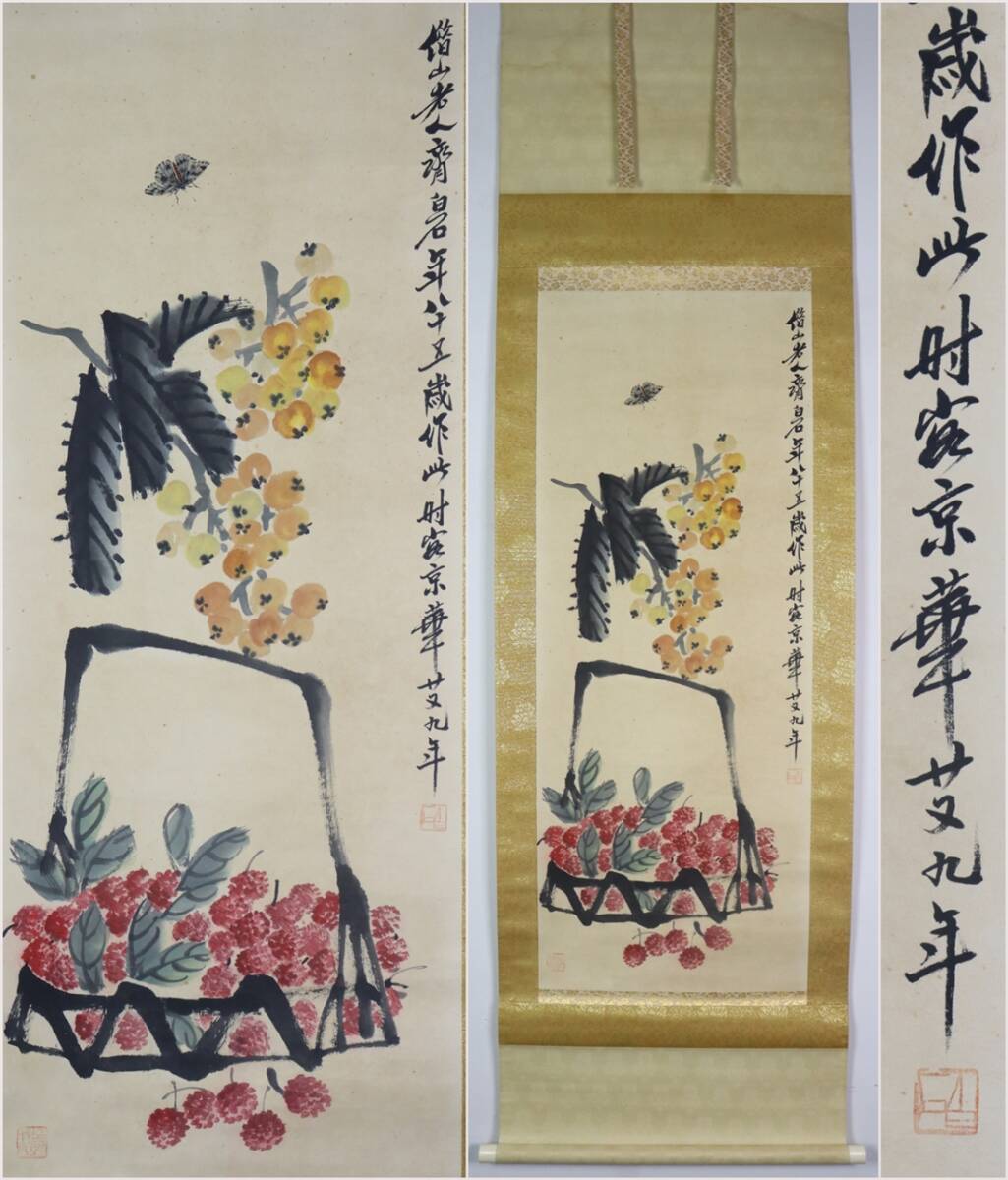 - 古美術 掛け軸 中国・近現代 「斉白石書」 紙本 【枇杷図】 立軸 書道 巻き物 肉筆保証 唐物 古画 画心40x104cm LT-241141