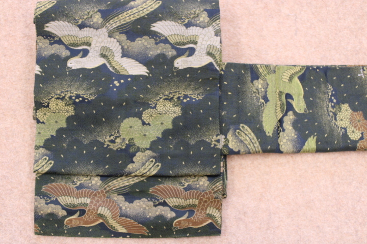 - きもの今昔7844 丸帯 西陣織 正絹両面全通丸帯 濃グリーン地白・赤・緑の三色エンゼル柄 帯の長さ390cm