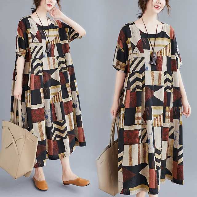 - 夏 新作 カジュアル幾何柄 ゆったり大きいサイズ 304050代体型カバー マキシ半袖ロングワンピース YWQ1479