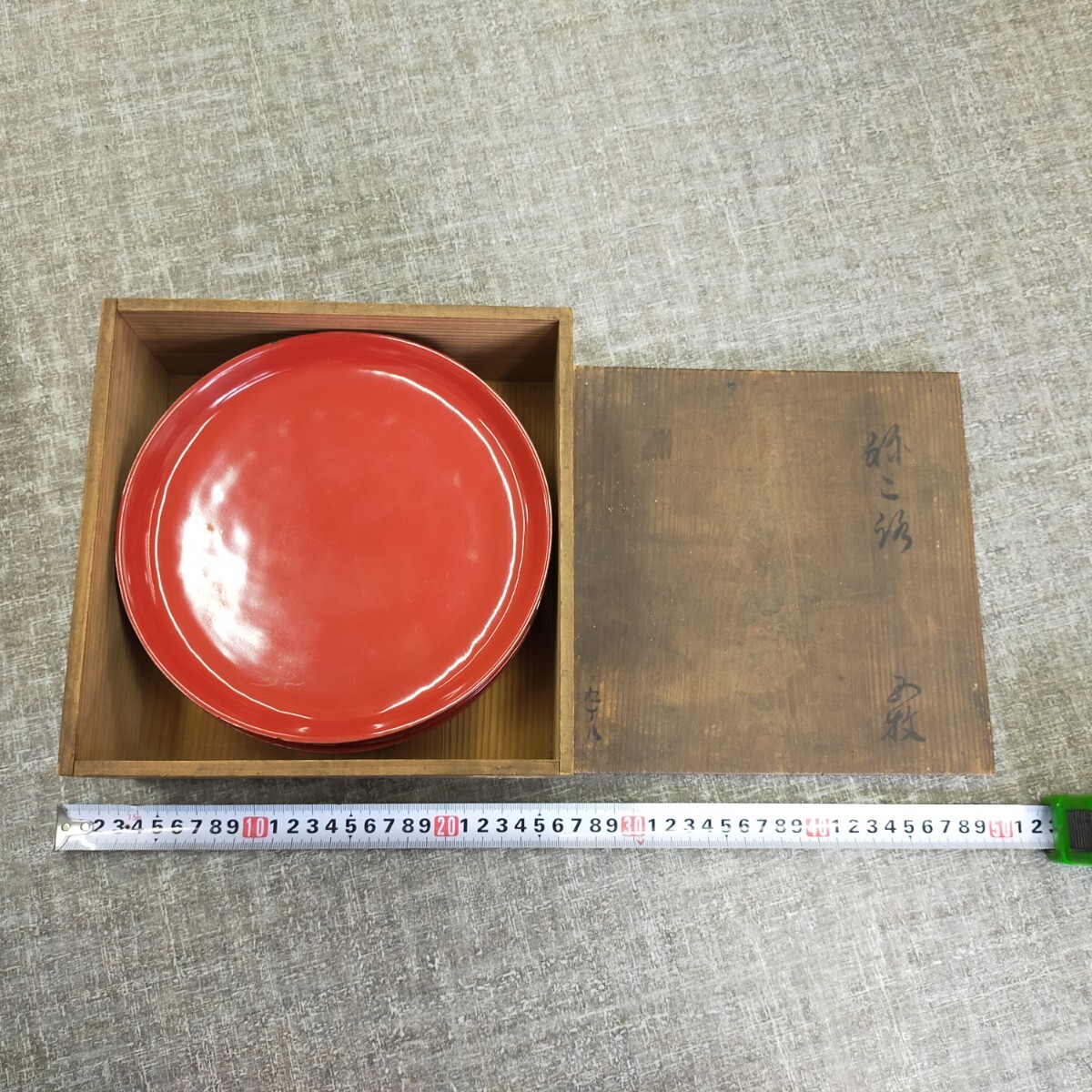 - す2370 銘々盆 食器 菓子皿 5枚セット 漆器 木箱付 漆芸 詳細不明 アンティ ーク