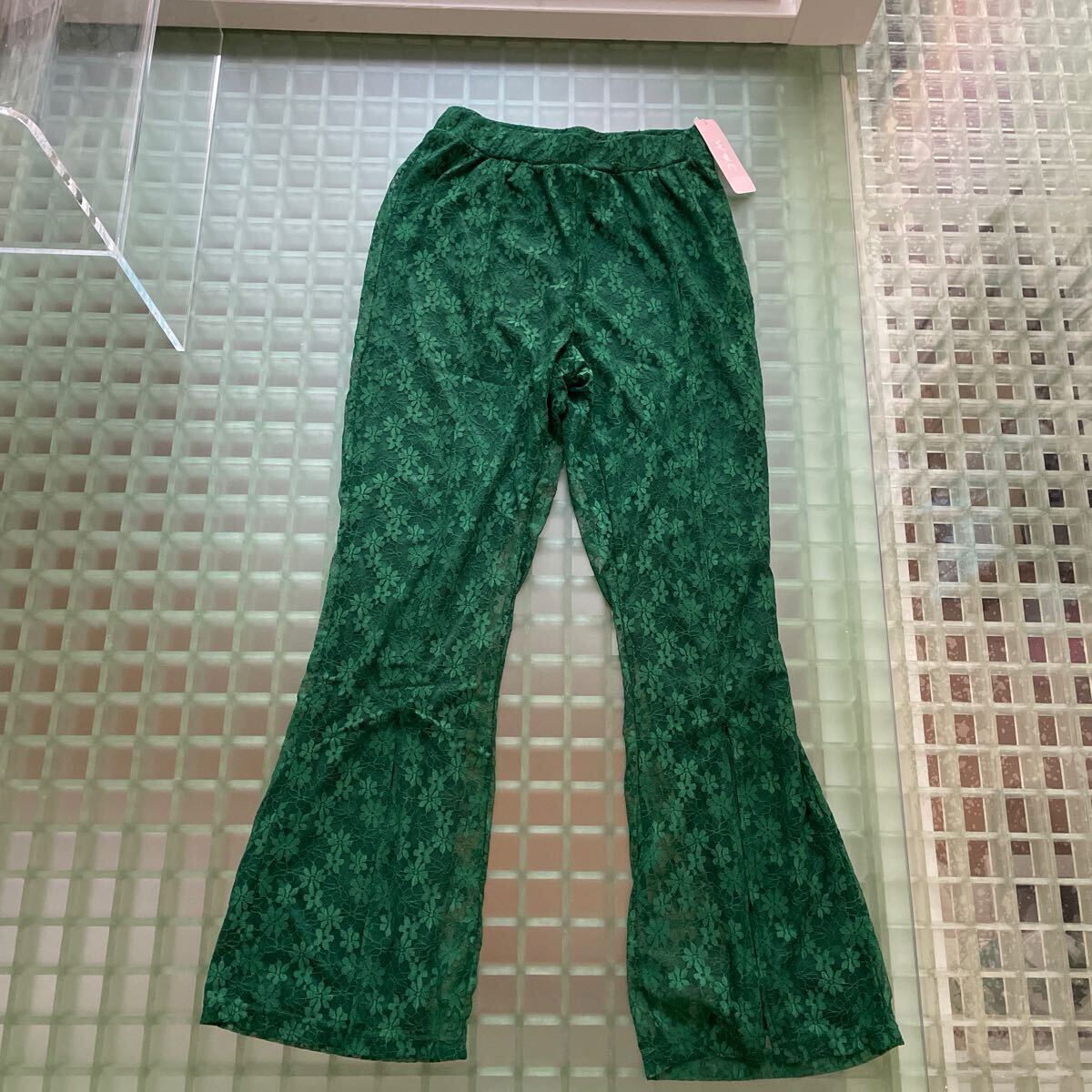 - 花柄 緑色 パンツ WC 昭和レトロ レース スリット フレアパンツ ベルボトム パンツ グリーン ボトムス ウエストゴム