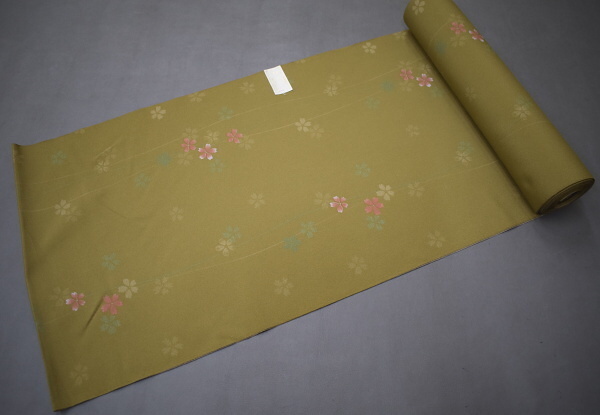 > A08-24【凛々】即決 新古品 ポリエステル 小紋 着尺反物 黄茶 桜 未仕立て品