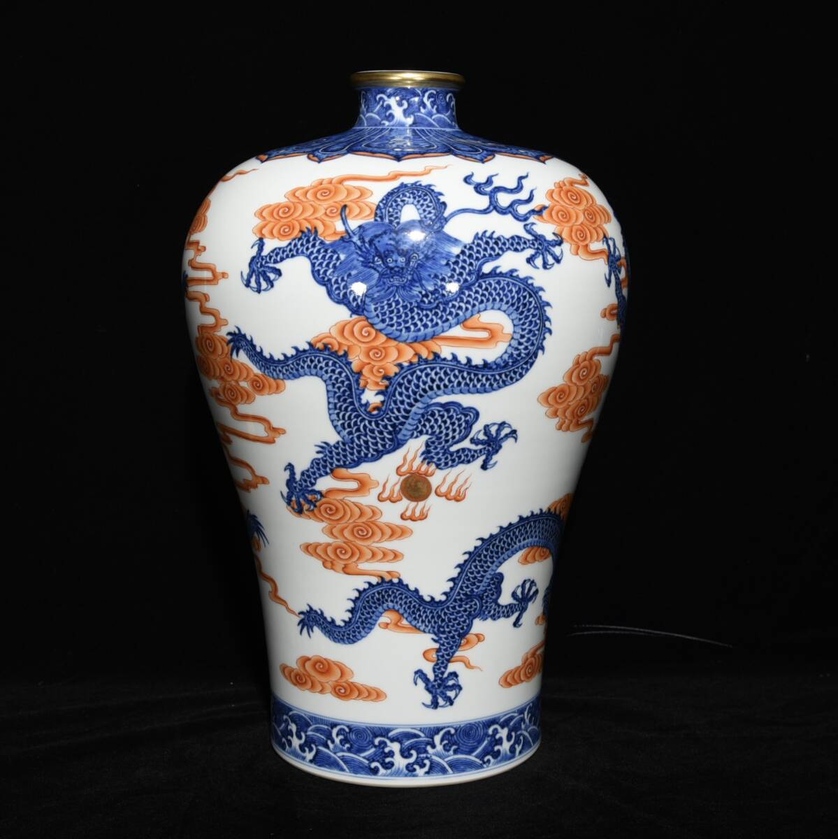 > ◆旧家蔵出◆古美術 中国古玩 大清乾隆年製款 青花 礬紅 描金 龍紋梅瓶 古賞物 骨董 時代物 A06