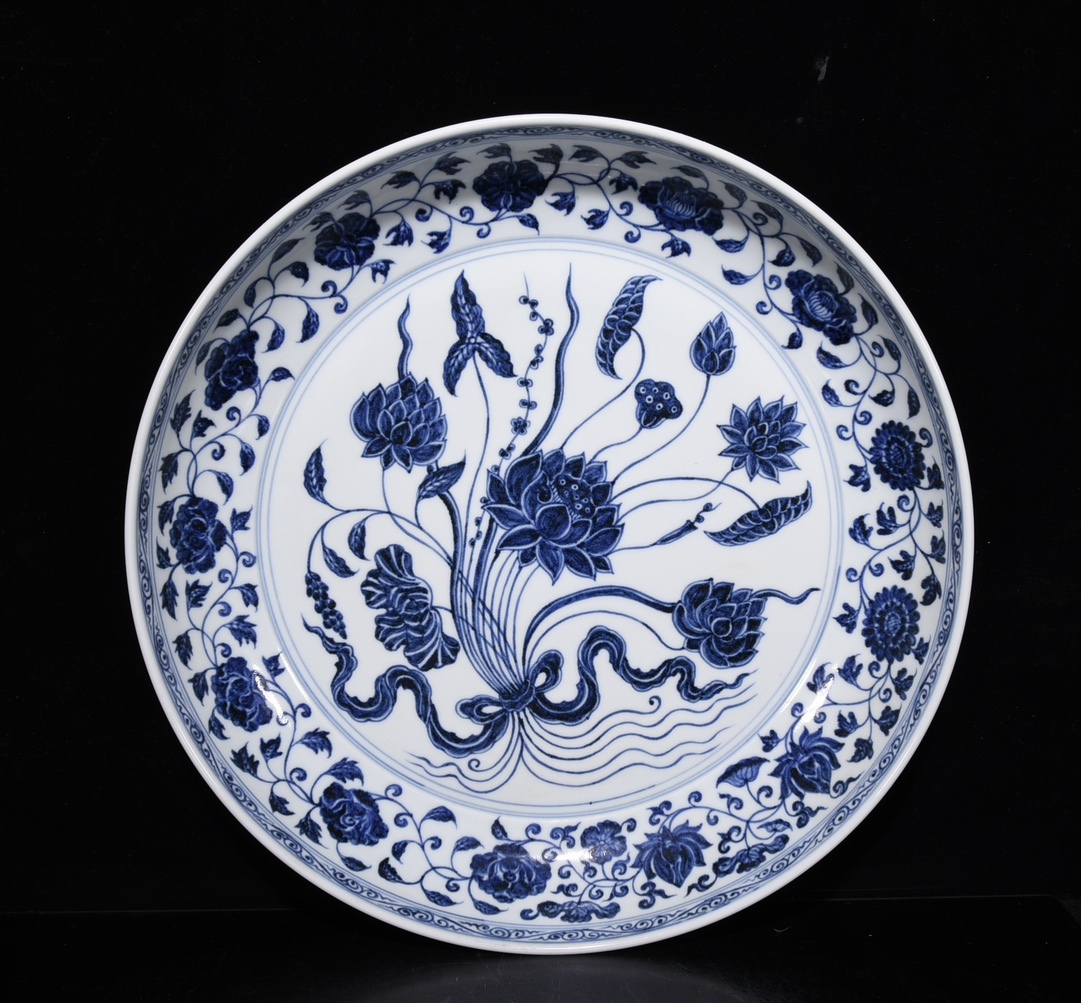 - ◆旧家蔵出◆古美術 中国古玩 大明宣徳年製款 青花 一束蓮紋大盤 古賞物 骨董 時代物 AT08
