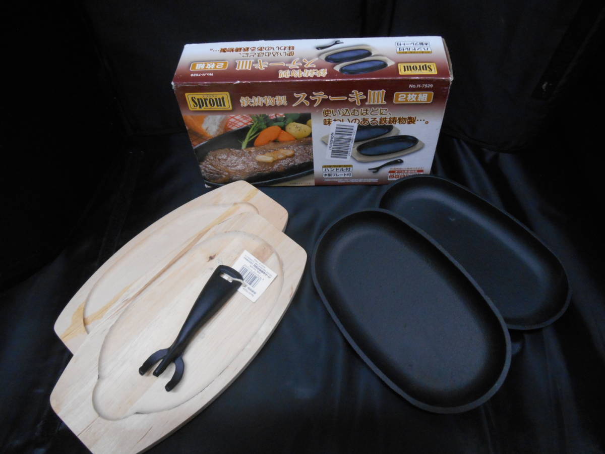 > ZZ20 新品 未使用 ステーキ皿 2枚組 Sprout スプラウト 鉄鋳物製 パール金属 ハンドル付 木製プレート付 オール熱源対応