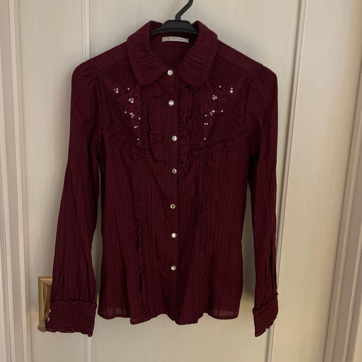 - axes femmeアクシーズファム ブラウス エンジ ビジュー フリル パール シャツ 長袖 トップス M