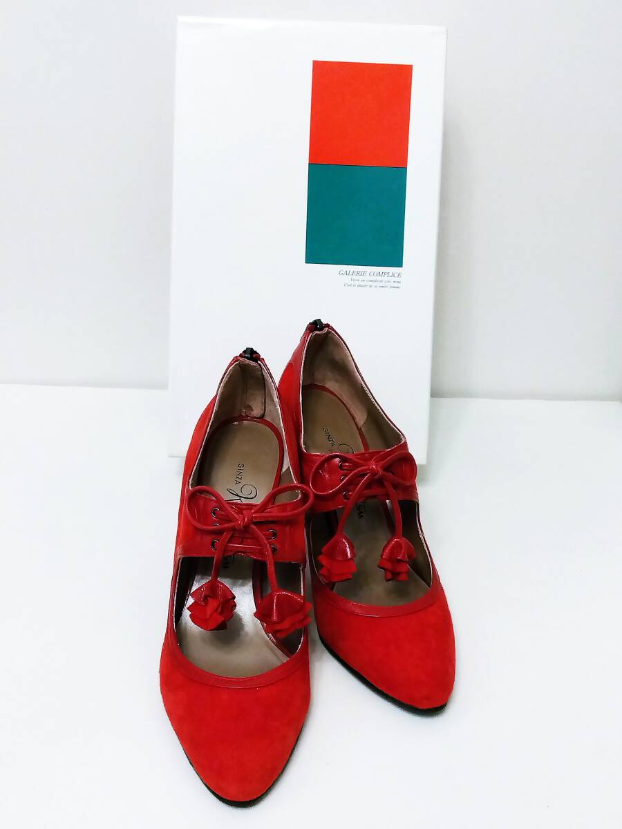 > 美品 銀座かねまつ カネマツ パンプス 22.5cm 赤 バックファスナー クリスマス パーティー ヌバッグ