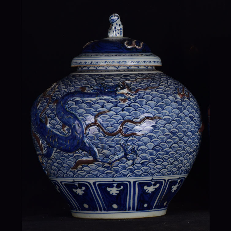 - ◆旧家蔵出◆古美術 中国古玩 元時代 元青花 釉里紅 高浮雕 龍紋盖罐 古賞物 骨董 時代物 A35