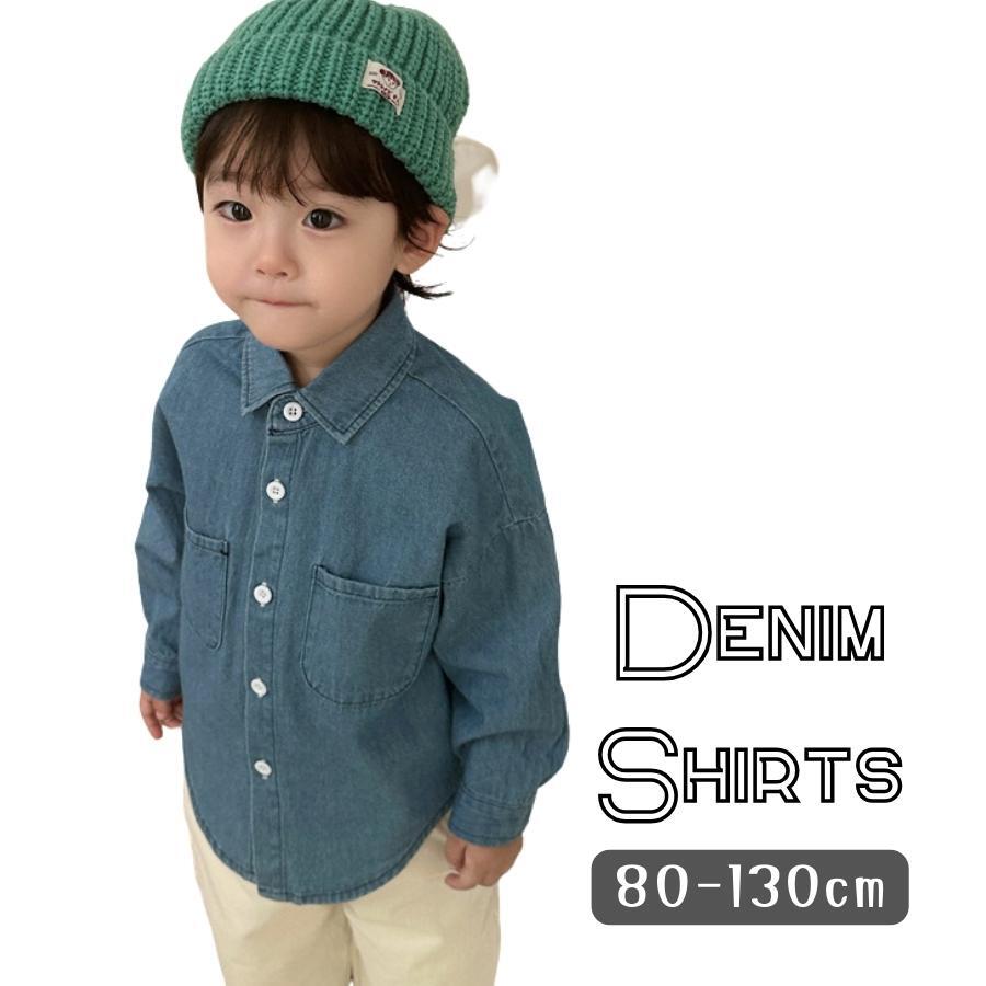 - デニム 長袖シャツ ボタンシャツ 胸ポケット 襟シャツ おしゃれ 子供服 男の子 ボーイズ カジュアル 韓国子供服 (110)