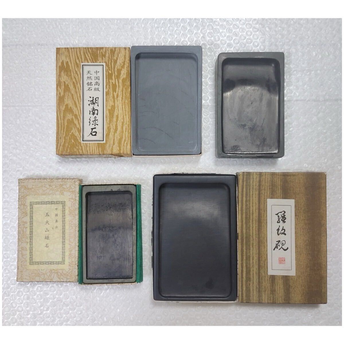 - 05 硯 すずり 書道具 4点 おまとめ 湖南綠石? 五大山緑石? 他 角形 中古品 箱中身相違有無不明
