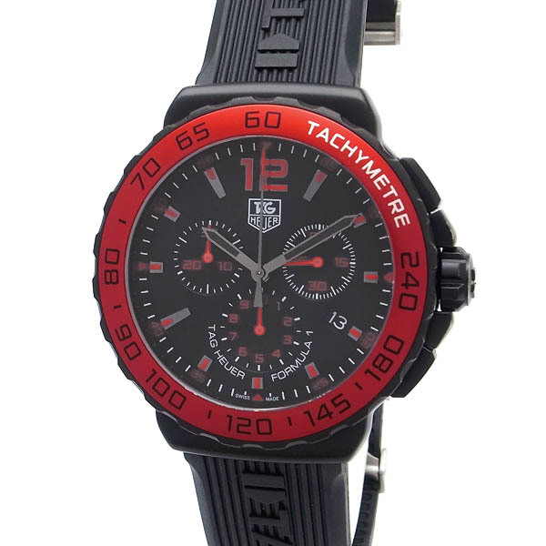 | コメント | タグ・ホイヤーの中でももっともスポーティな時計「フォーミュラ1」。 F1をモチーフとした3カウンタークロノグラフ、ベゼルに設置されたタキメータースケールがスポーティな雰囲気を醸し出しております。 4時位置には日付表示が設置されており、普段使いにもオススメの一本です。 リューズとリューズガードにスレがあり、コーティングがすれて下地のシルバー色が出てますが、際立って目立った感じではありません(画像参照)。 また、12時側のガラス縁付近にスレ傷、11時側のラグに小傷、裏蓋に線傷が御座います(画像参照)。 メンズサイズ・クォーツモデル。 緑屋商品番号:1127724 | | 程度 | 中古Aランク | | 素材・色 | SS(DLCコーティング)/ラバー | | サイズ | フェイス径42mm(リューズ除く) | | 付属品 | ギャランティーカードなし 箱なし |