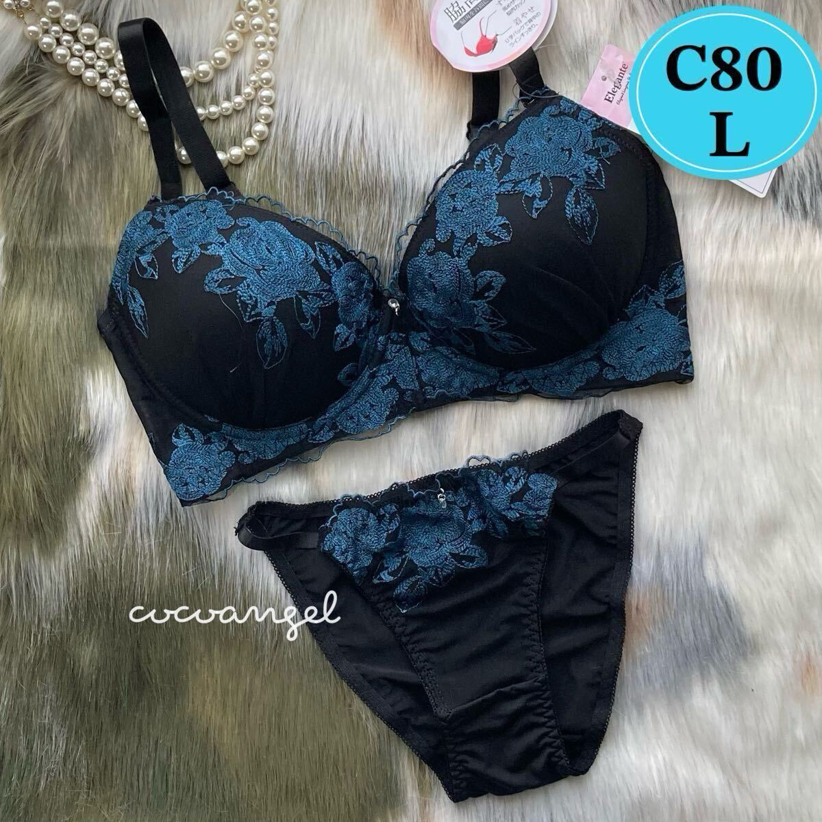> 【C80-L ブラック 上下セット】新品 ブラ&ショーツ ブラジャーショーツセット パッド付き 脇高 バラ刺繍 薔薇 セクシーパンティ Cカップ