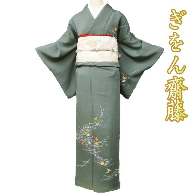 > 特選 訪問着 着物 中古 正絹 袷 紋付き ぎをん斎藤 吹き寄せ文 縮緬地 老竹色 多色 金 身丈164cm 裄64.5cm L きもの北條 A1125-11