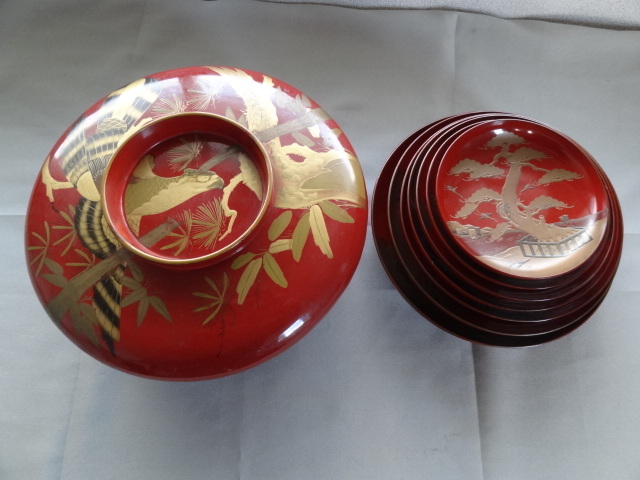 - ●漆器 大平 & 7組皿 蒔絵 朱塗 木製漆器 金蒔絵 茶道具 菓子器 時代物 骨董品 古美術品 ●