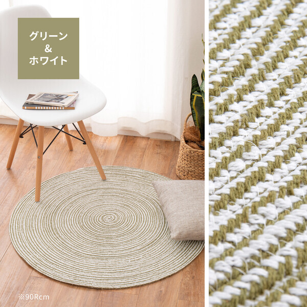 - ラグ インド綿ラグ チューブラグ 直径約140cm グリーン ホワイト 円形 洗濯機で洗える ブレイド
