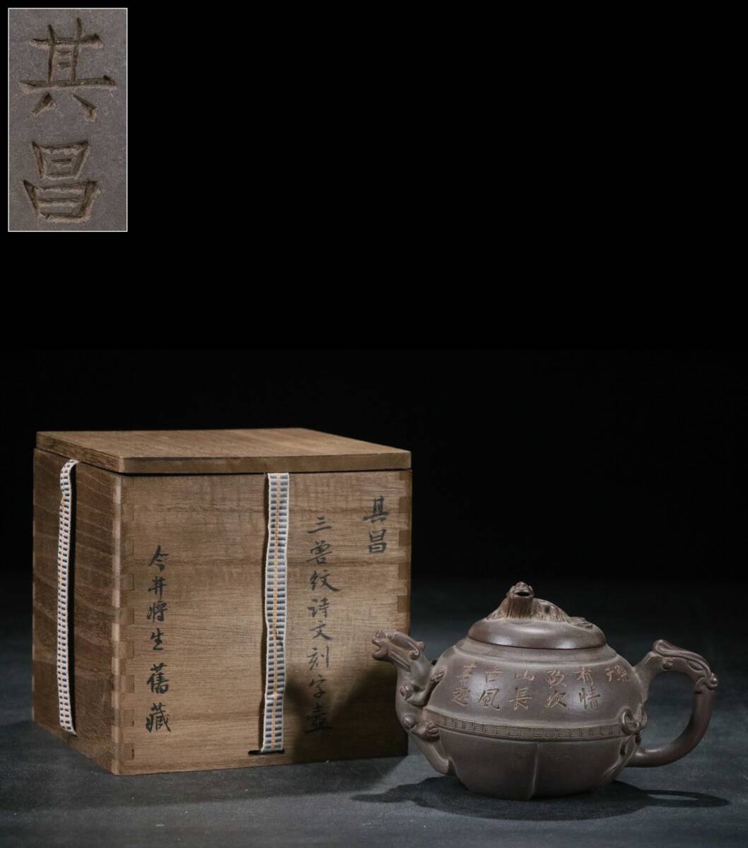 > 茶器 紫砂壷【今井生旧蔵】「三獣紋詩文刻字壷」在銘「其昌」茶壷 煎茶器 唐物 時代物 古陶芸 長さ17.5cm、幅11.5cm、高さ10.3cm LB-12213