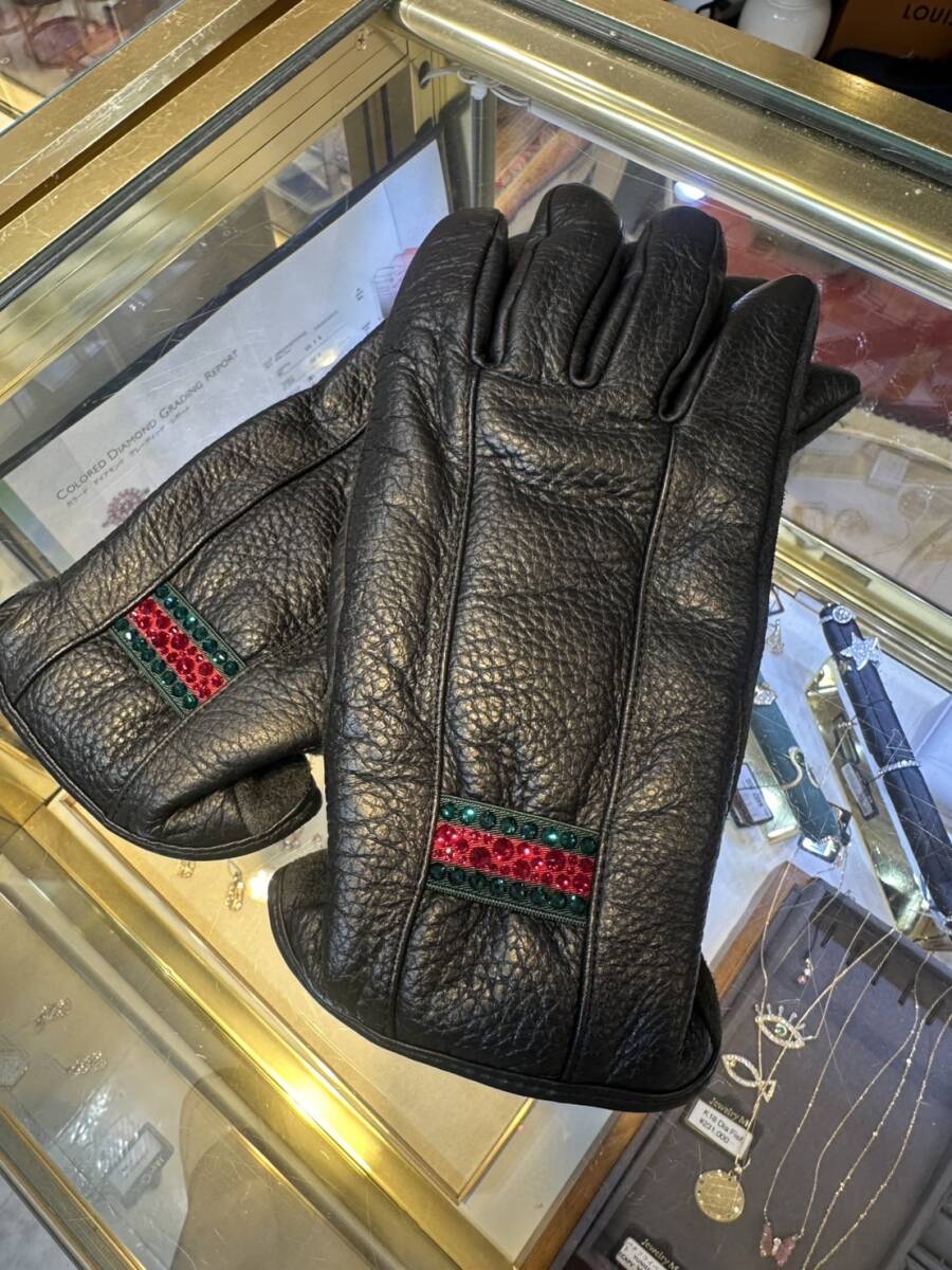 - 【ラグジュアリー極】GUCCI シェリーライン スワロフスキー クリスタル ラインストーン レザー 手袋 グローブ 本革 ビジュー ジャケット