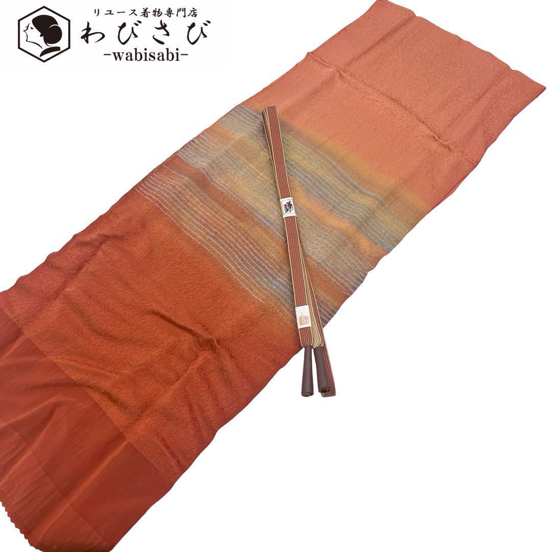 赤錆色ベースのお色味に暈しや横縞模様がデザインされた帯揚げ、御岳組の帯締めの素敵なお品でございます。