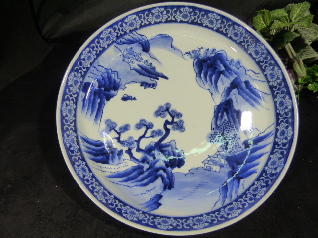 - ほ174.大皿 染付 山水画 「青」裏印 角青 Φ30.5cm