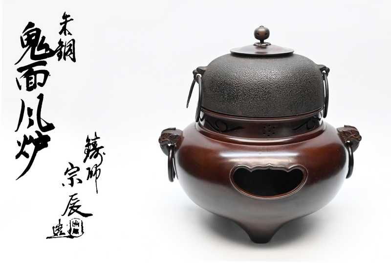 - 鬼面風炉■ 朱銅 鋳師 [宗辰] 風炉 茶釜 ■ 茶道具 釜鐶(かまかん)付 木箱入り ■