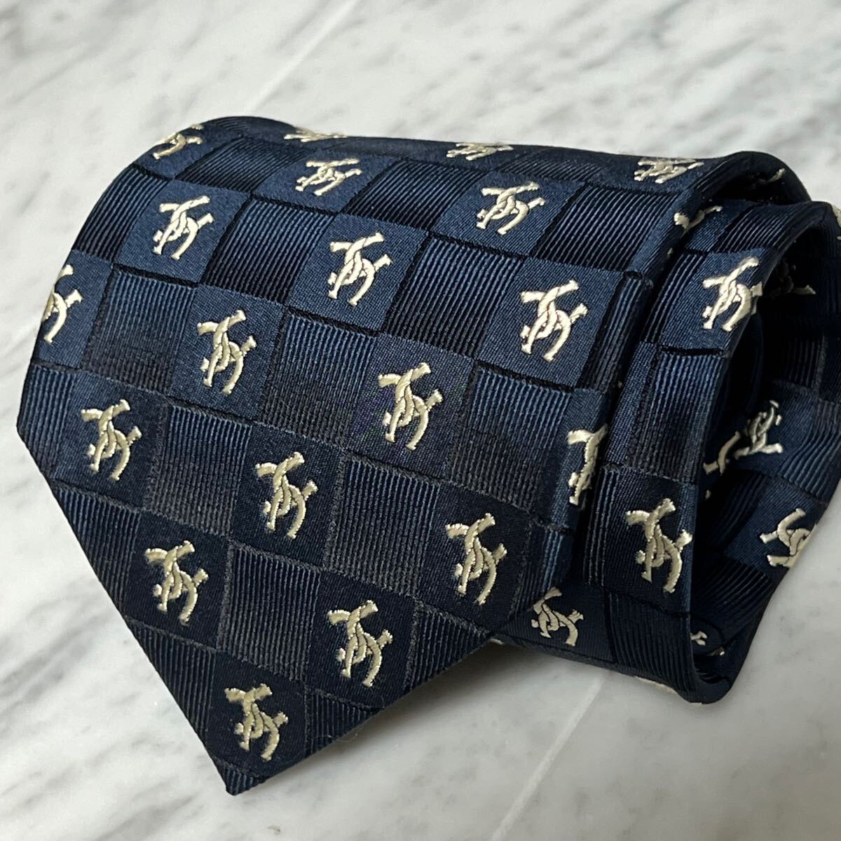 - 【美品】 999円~ 日本ダービー ネクタイ ネイビー ブロックチェック柄 馬 ホース (B10)