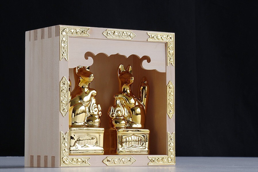 - 極上 木曽桧製 五合枡入り■ 黄金 稲荷 (狐)一対 ■ 金メッキ お稲荷様 国産陶器■ 神棚のお飾りに