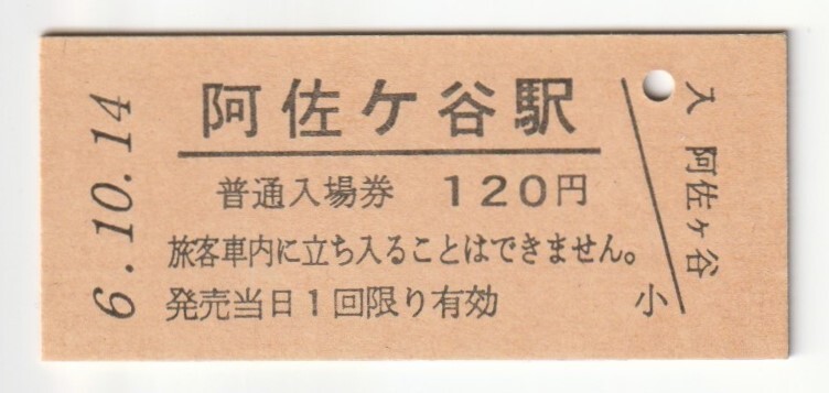 - 平成6年10月14日 中央本線 阿佐ヶ谷駅 120円硬券普通入場券(日付印刷)
