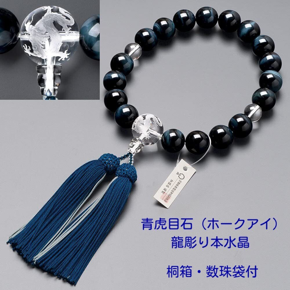 - 京念珠 数珠 男性用 青虎目石(18玉) 龍彫り本水晶 正絹頭付房 数珠袋付