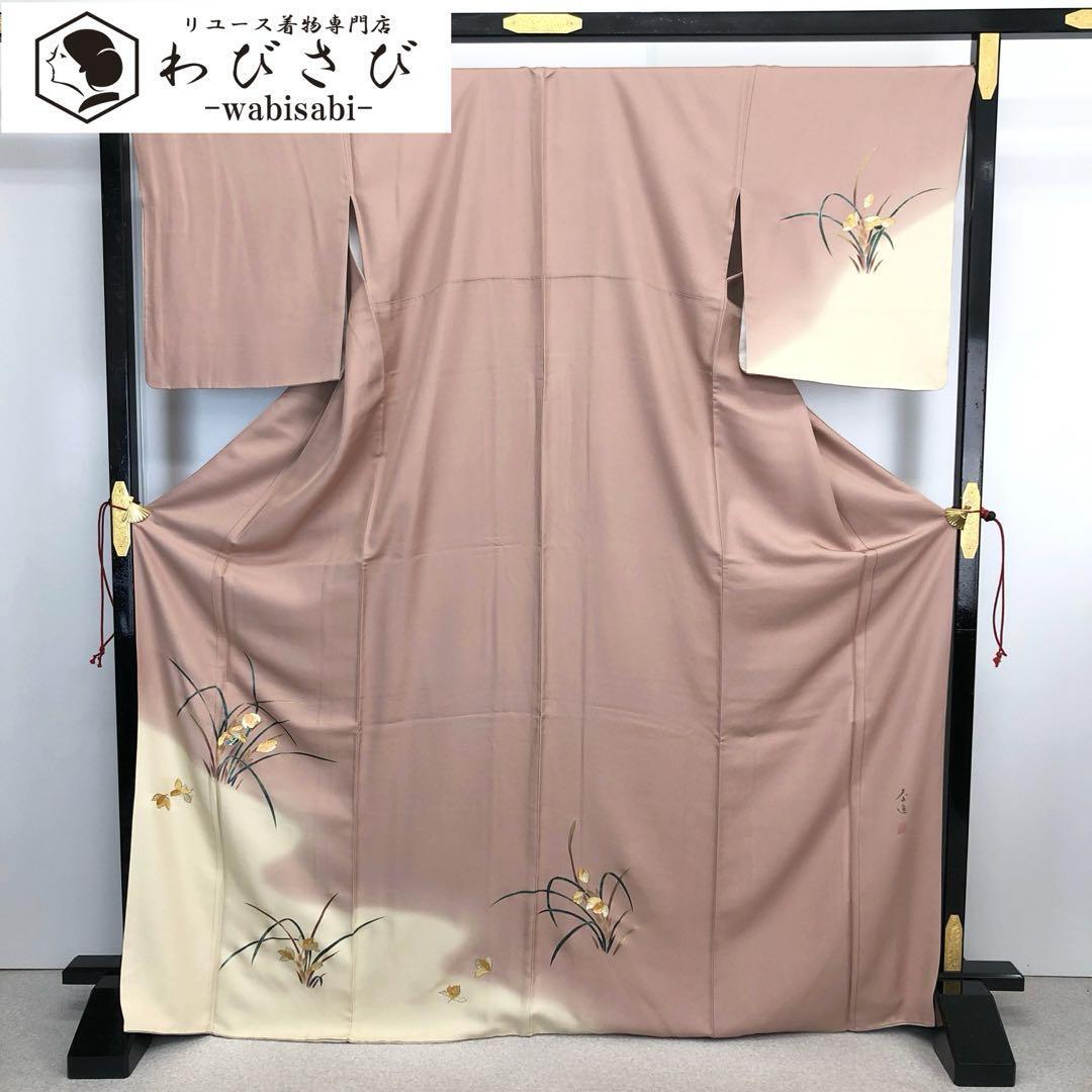 退紅色ベースの品のあるお色味に暈し、煌びやかな螺鈿が使われた上品な花模様がデザインされた素敵な柄裄のお品でございます。