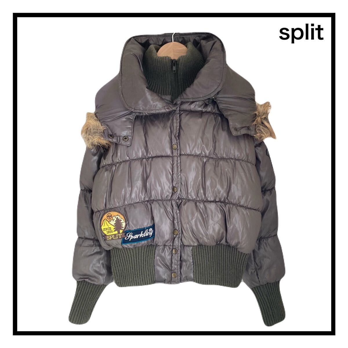 - split ダウンジャケット 中綿 パッチ 刺繍 カーキ レディース ファー